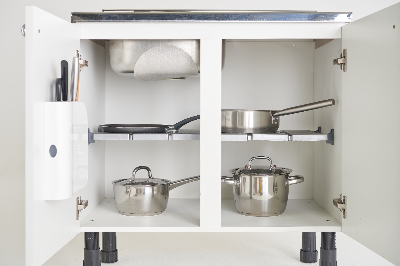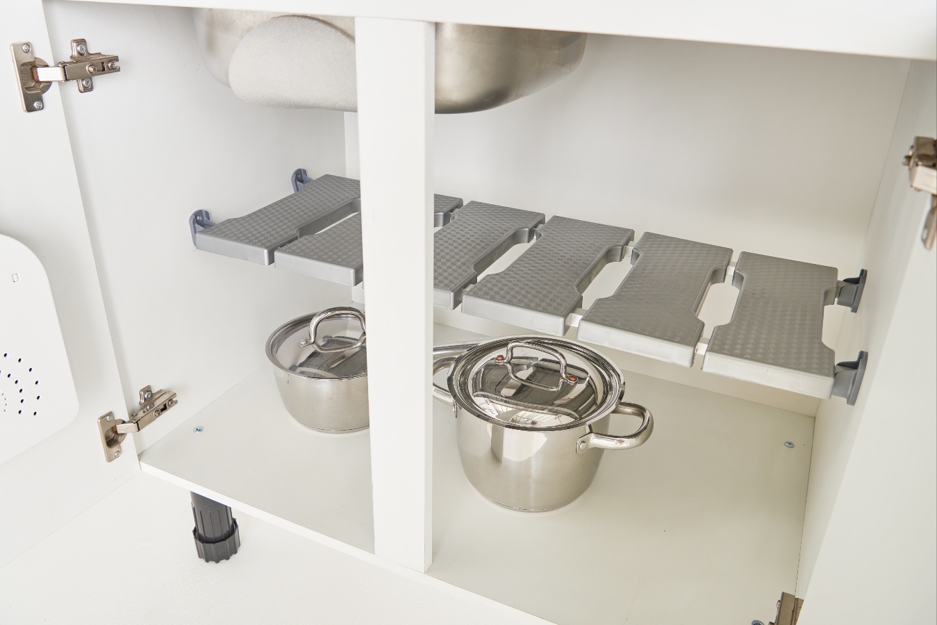 - 씽크장 하부 배수구가 위치한 공간의 복잡한 구조를 깔끔하게 정리할 수 있음